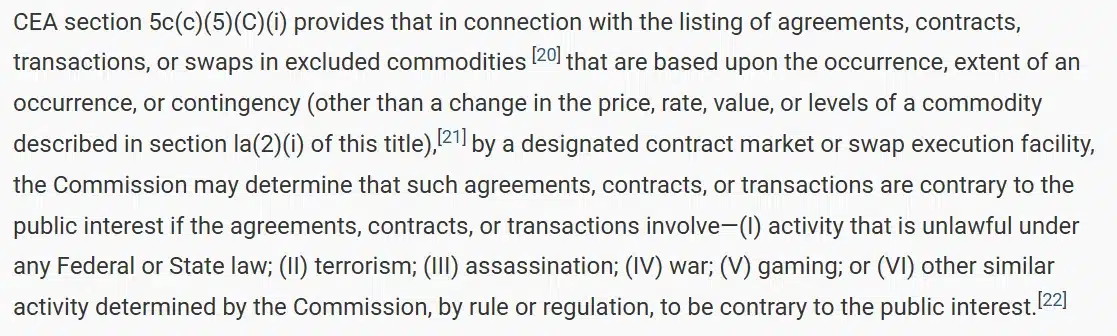 In 2010, Congress codified the CFTC’s jurisdiction over event markets through Section 745(b) of the Dodd-Frank Act, which added Section 5c(c)(5)(C) to the Commodity Exchange Act (CEA). The new provision empowered the CFTC to prohibit contracts deemed “contrary to the public interest” explicitly naming five restricted categories: terrorism, assassination, war, unlawful activity, and gaming. One year later, the CFTC implemented Rule 40.11, formalizing that mandate: any exchange that listed a contract related to those subjects would be subject to review and possibly denial.