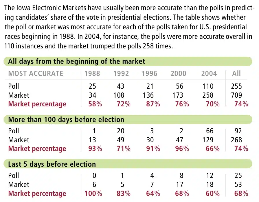 By 1992, the project had grown into the Iowa Electronic Markets (IEM), a permanent, internet-based exchange with CFTC no-action relief from the Commodity Futures Trading Commission (CFTC) as an academic research market exempt from standard derivatives regulation. This federal allowance, granted because of the small sums involved, allowed anyone with five dollars and a modem to trade. Over time, the IEM’s performance proved impressive: between 1988 and 2004, its prices outperformed traditional polls roughly three quarters of the time.